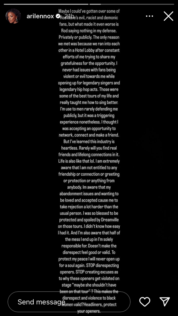 Reflecting on her past tours with Dreamville, where she felt protected and valued, Lennox contrasted the negative experience on Rod Wave’s tour. She condemned the excuses made for mistreating opening acts and urged headliners to prioritize the safety and respect of their supporting artists, especially Black women.