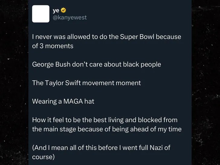 In a now-deleted post on X, West claimed three moments from his career have kept him from headlining the coveted halftime show. Among them: his infamous “George Bush doesn’t care about Black people” comment during a Hurricane Katrina telethon, his public support of Donald Trump by wearing a MAGA hat, and what he labeled the “Taylor Swift moment.”