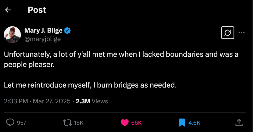 “Unfortunately, a lot of y’all met me when I lacked boundaries and was a people pleaser,” the singer wrote. “Let me reintroduce myself, I burn bridges as needed.” While it’s unclear what sparked this response from Mary J. Blige, it’s very clear that she’s no longer the naive girl she was at the beginning of her career.