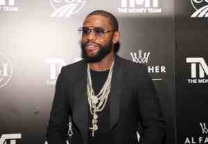 MEXICO CITY, MEXICO – 2024/08/23: Floyd Mayweather Jr. attends the scales during the ceremonial weigh-in before the exhibition fight between American boxer and former world champion Floyd Mayweather Jr. and mixed martial arts fighter and professional boxer John Gotti III. (Photo by Carlos Santiago/Eyepix Group/LightRocket via Getty Images)