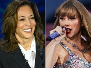 (COMBO) This combination of pictures created on September 10, 2024 showsUS Vice President and Democratic presidential candidate Kamala Harris smiles during a presidential debate with former US President and Republican presidential candidate Donald Trump at the National Constitution Center in Philadelphia, Pennsylvania, on September 10, 2024. American singer and songwriter Taylor Swift performs on stage as part of her Eras Tour in Lisbon on May 24, 2024.. Taylor Swift, a self-declared “childless cat lady,” has endorsed Kamala Harris for president of the United States. The global megastar broke her silence on the current state of US politics September 10, 2024, voicing support for Harris over Donald Trump for the White House, and calling the Democratic candidate a “steady-handed, gifted leader.” (Photo by SAUL LOEB and ANDRE DIAS NOBRE / AFP) (Photo by SAUL LOEBANDRE DIAS NOBRE/AFP via Getty Images)