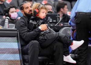 TORONTO, ON – APRIL 7: Drake sits with his son Adonis before the Toronto Raptors play the Philadelphia 76ers in their basketball game at the Scotiabank Arena on April 7, 2022 in Toronto, Ontario, Canada. NOTE TO USER: User expressly acknowledges and agrees that, by downloading and/or using this Photograph, user is consenting to the terms and conditions of the Getty Images License Agreement. (Photo by Mark Blinch/Getty Images)”n”n”n”n”n