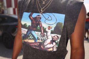 Inglewood, CA – June 19: Michael White displays his Kendrick Lamar slavery tee shirt dissing Drake before the Kendrick Lamar Pop Out concert on Juneteenth at The Forum on Wednesday, June 19, 2024 in Inglewood, CA. (Michael Blackshire / Los Angeles Times via Getty Images)