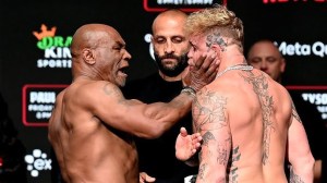 ARLINGTON, TEXAS – MAY 16: (L-R) Mike Tyson, Nakisa Bidarian and Jake Paul pose onstage during the Jake Paul vs. Mike Tyson Boxing match Arlington press conference at Texas Live! on May 16, 2024 in Arlington, Texas. (Photo by Cooper Neill/Getty Images for Netflix)