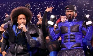 LAS VEGAS, NEVADA – FEBRUARY 11: (L-R) Ludacris, Usher, and Lil Jon perform onstage during the Apple Music Super Bowl LVIII Halftime Show at Allegiant Stadium on February 11, 2024 in Las Vegas, Nevada. (Photo by Kevin Mazur/Getty Images for Roc Nation)