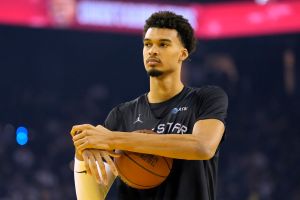 OAKLAND, CALIFORNIA – FEBRUARY 15: Victor Wembanyama #1 of the San Antonio Spurs and Chuck’s Global Stars looks on during 2025 NBA All-Star Practice & Media Availability at Oakland Arena on February 15, 2025 in Oakland, California. NOTE TO USER: User expressly acknowledges and agrees that, by downloading and or using this photograph, User is consenting to the terms and conditions of the Getty Images License Agreement. (Photo by Thearon W. Henderson/Getty Images)