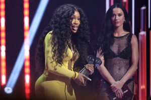 HOLLYWOOD, CALIFORNIA – APRIL 01: (L-R) SZA accepts the Song of the Year Award for “Kill Bill” onstage from Katy Perry during the 2024 iHeartRadio Music Awards at Dolby Theatre on April 01, 2024 in Hollywood, California. (Photo by Amy Sussman/Getty Images)